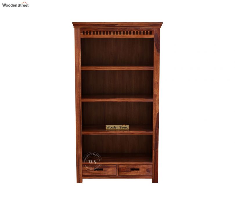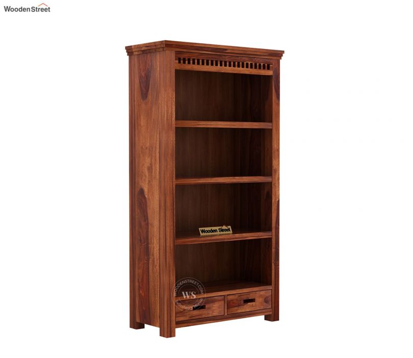 A bookshelf design wrapped in contemporary touch. It has a triple layer top, followed by detailed slots on the edge of the bookshelf. It is segmented in four shelves with two drawers below. Both the drawers have two rectangular slots that also work as handles for easy pull.