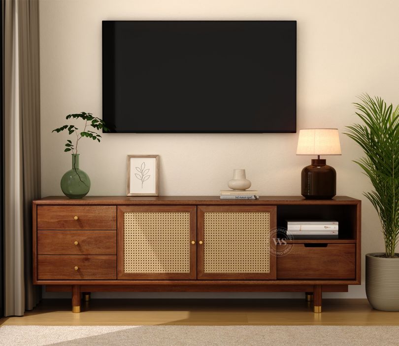 • MaterialPremium Mango Wood, Natural Cane Design, Metal Knobs, 3 In Line Drawer Storage, Open Shelf, Spacious Cabinets